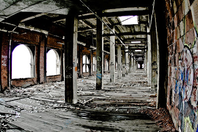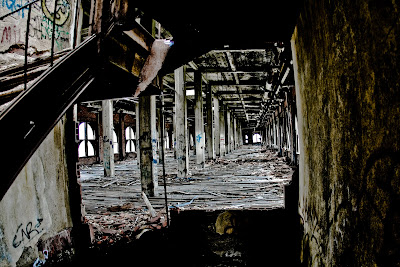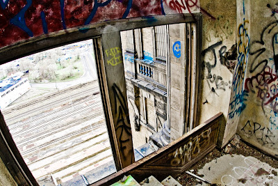 Eventually, the light in the stairs got better. A lot better. as did the air quality. We were so high. The top two floors. They were never finished. In any other city these incredible floor spaces would fetch top dollar. can you imagine this space in New York City? One loft space would go for millions.We roamed around and I got many shots of these incredible floors