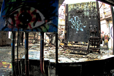I’m always amazed at the quality of art left behind with a spray can. Sure it’s graffiti. Sure it’s vandalism, but there is something raw and real about this noncommissioned art work that somebody who climed 18 flights of stairs carryig paint cans can leave behind. I found this room and the artwork within it to be some of my all time favorites. It doesn’t hurt that so few people will ever get to see it. So I’ve captured it so others may enjoy it without the climb. I also thought there was a really cool contrast with all the circuits and machine stuff up here. A clash of right and left brain 220 feet above the ground!