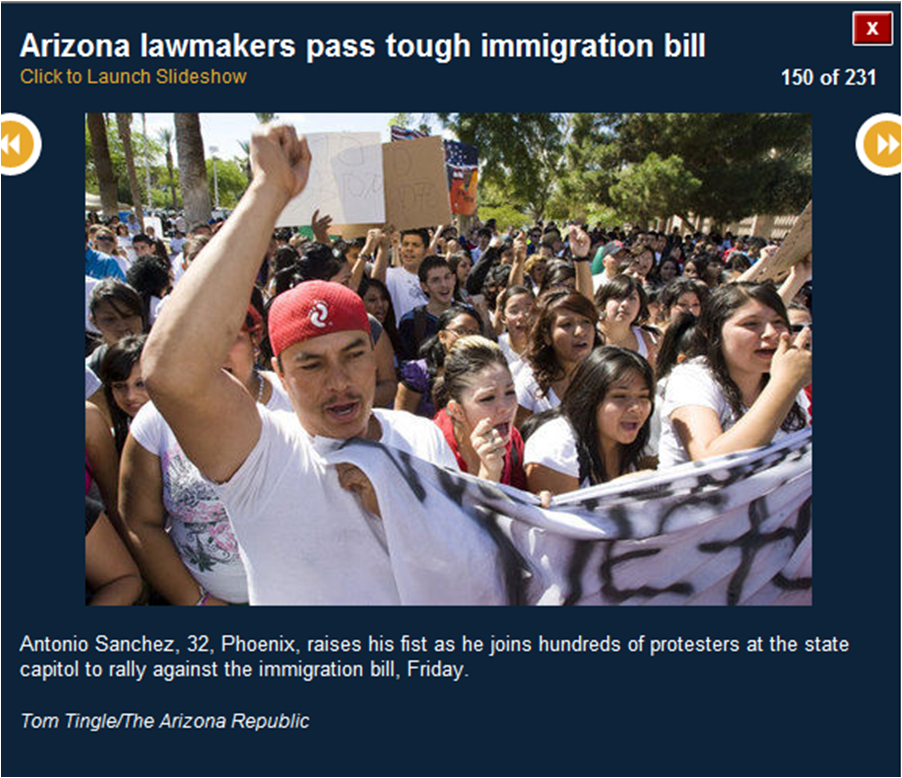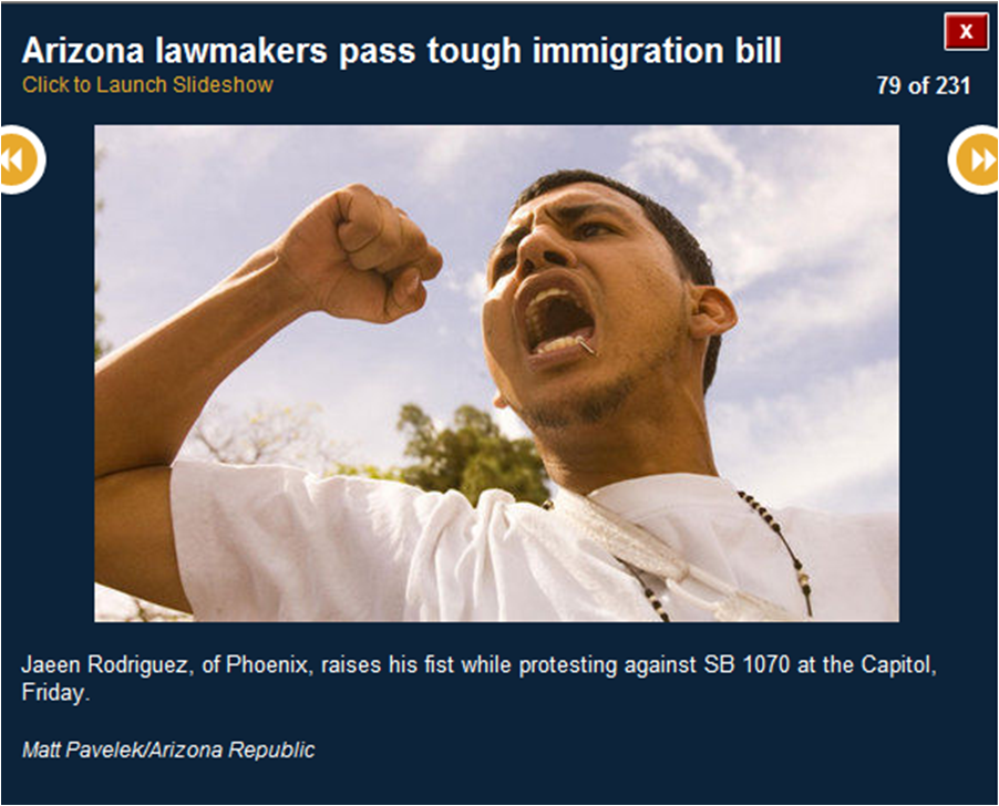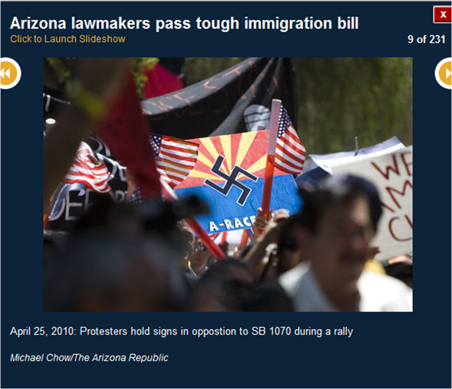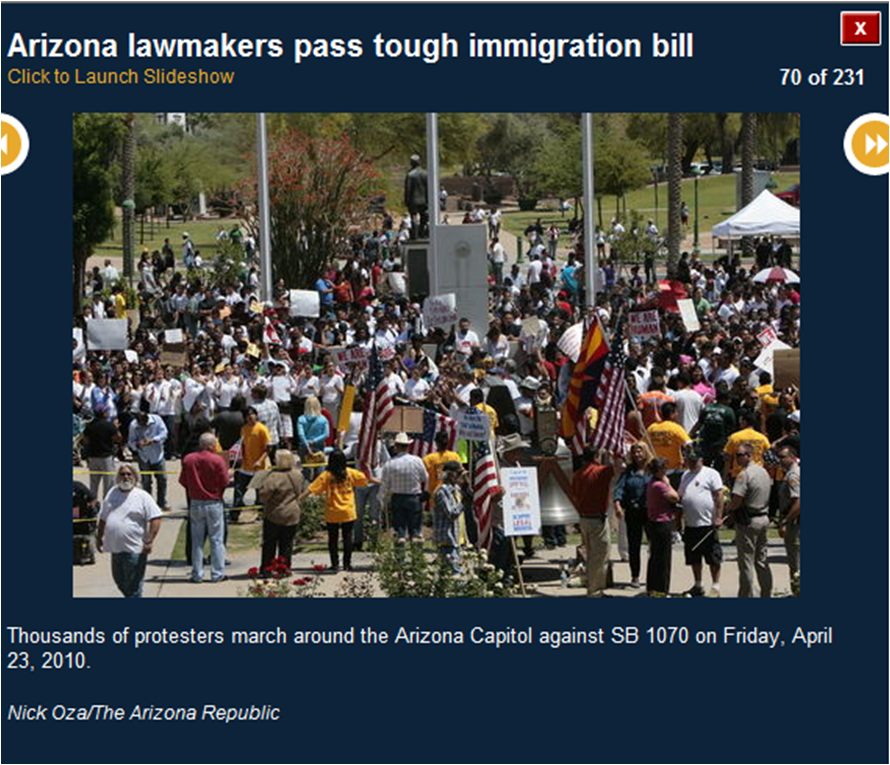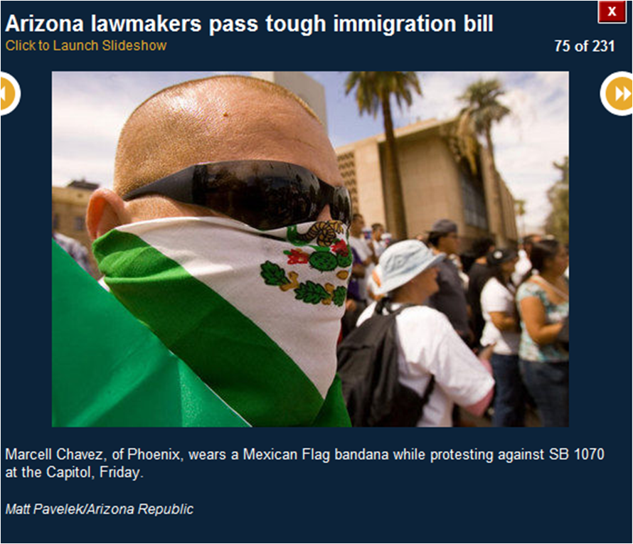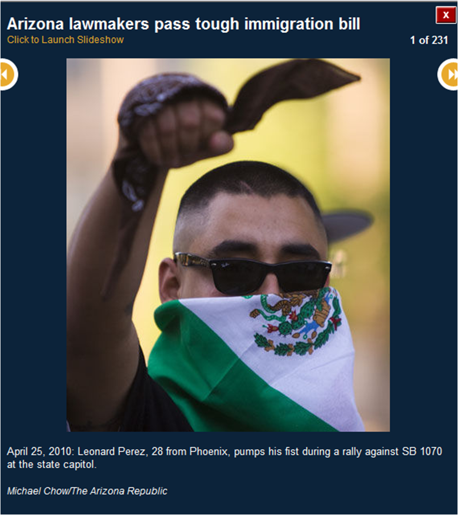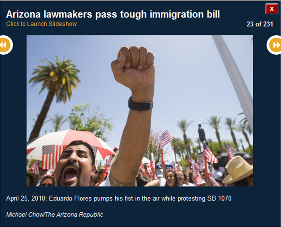 The pictures included here are all downloaded from the azcentral.com website. I use them to prove that many of the activists were bused in from Los Angeles. I show you the masks (think who else wears masks) and the raised fists (remember who did that?) and the hateful signs. I also show you pictures of the crowds (hundreds, not thousands).