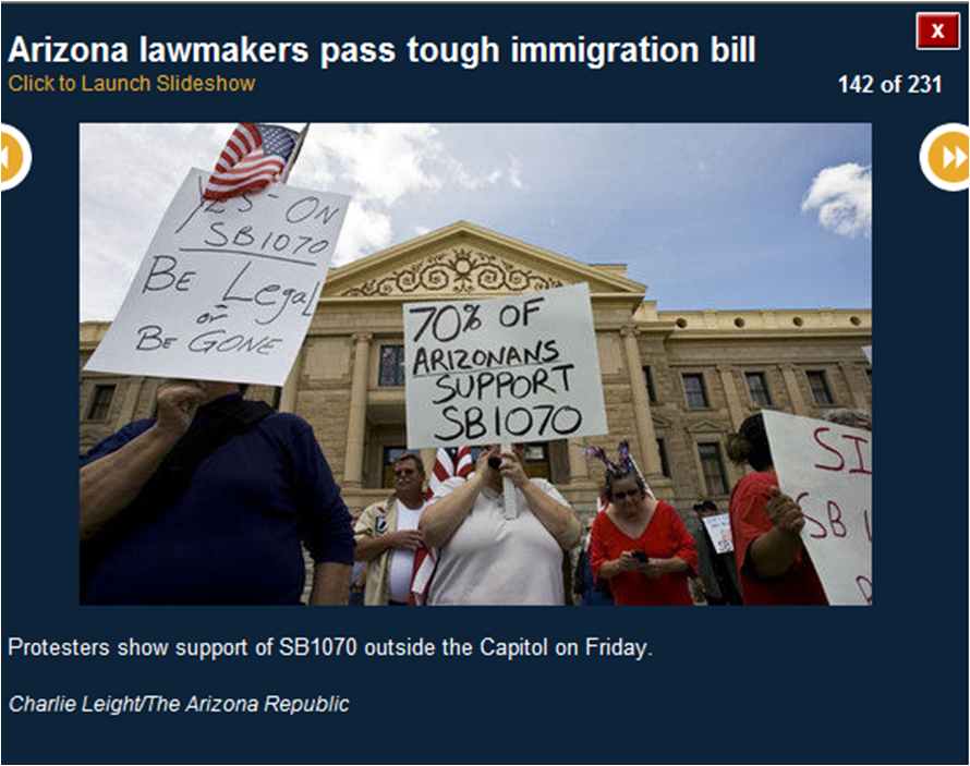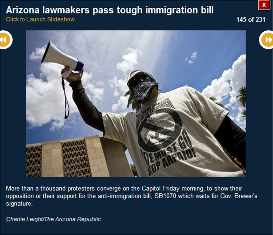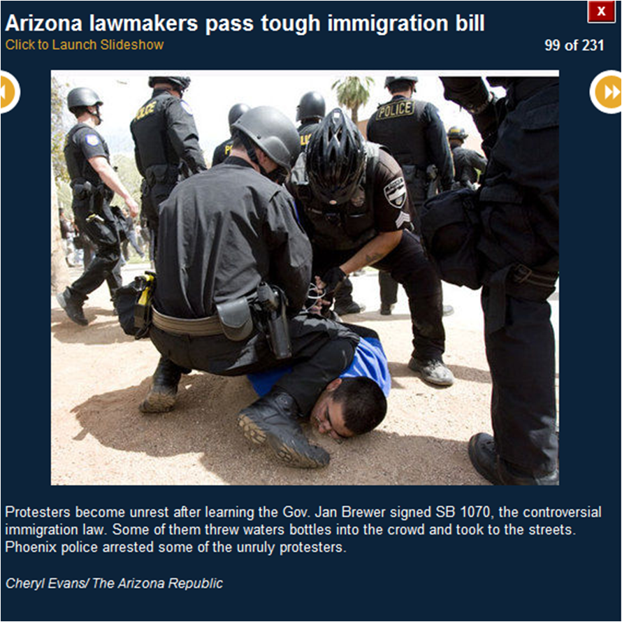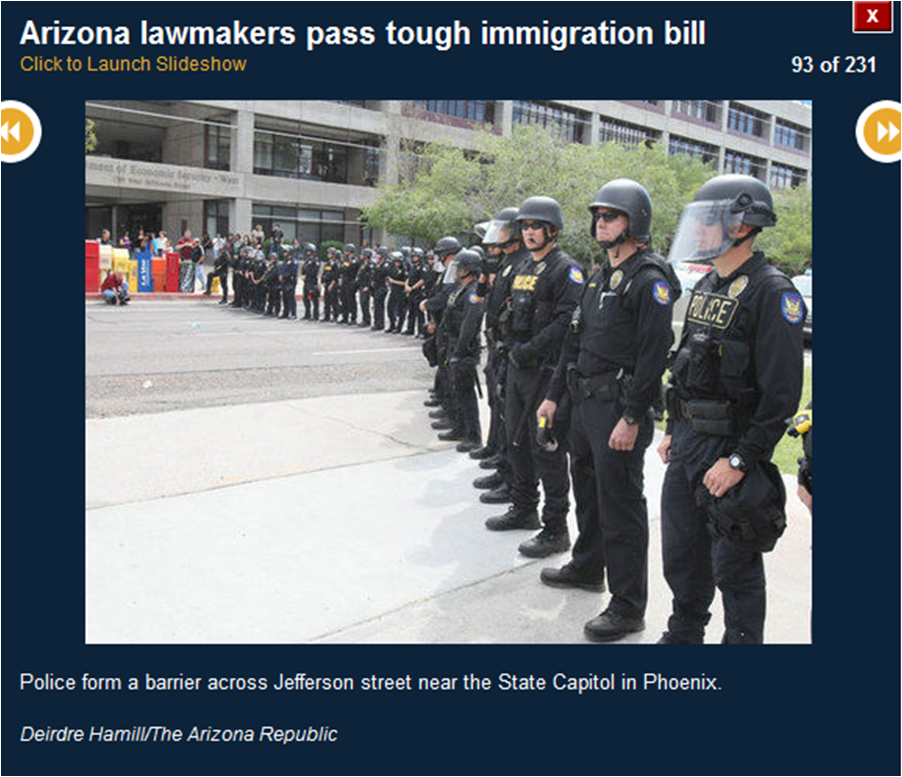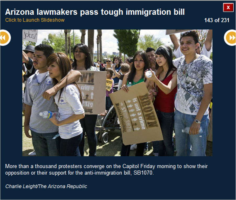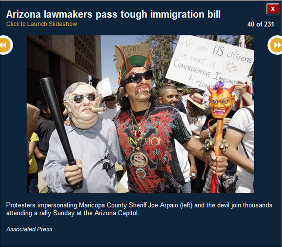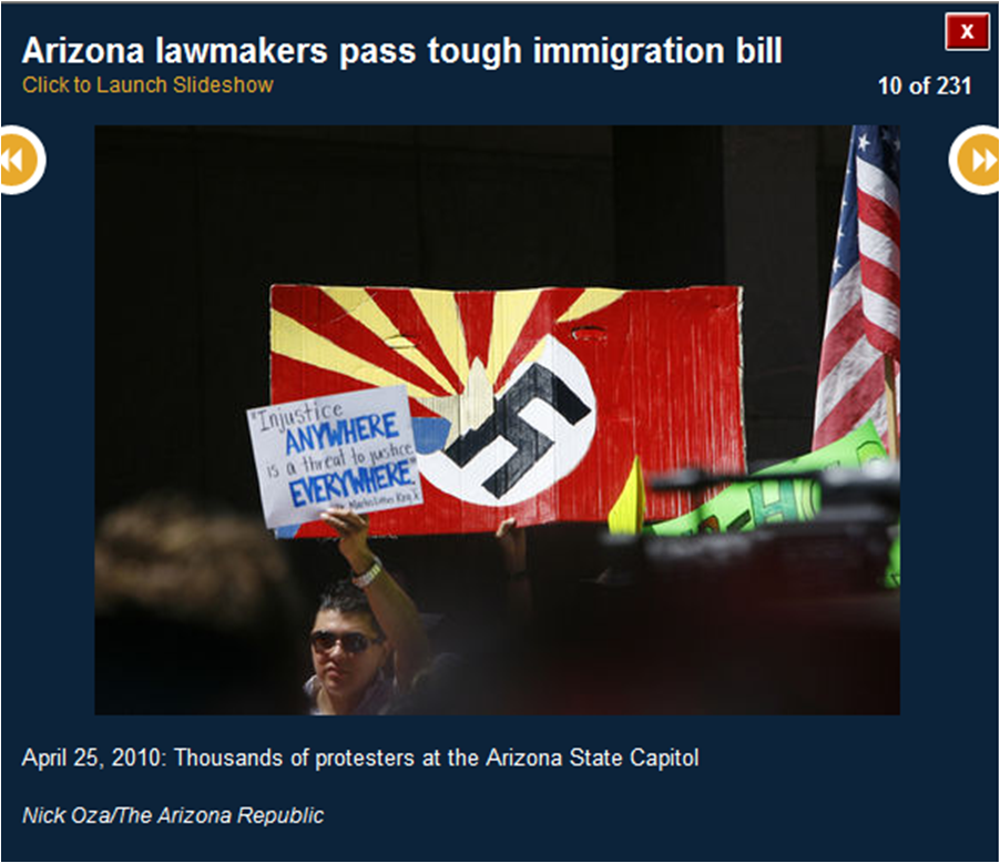 The pictures included here are all downloaded from the azcentral.com website. I use them to prove that many of the activists were bused in from Los Angeles. I show you the masks (think who else wears masks) and the raised fists (remember who did that?) and the hateful signs. I also show you pictures of the crowds (hundreds, not thousands).