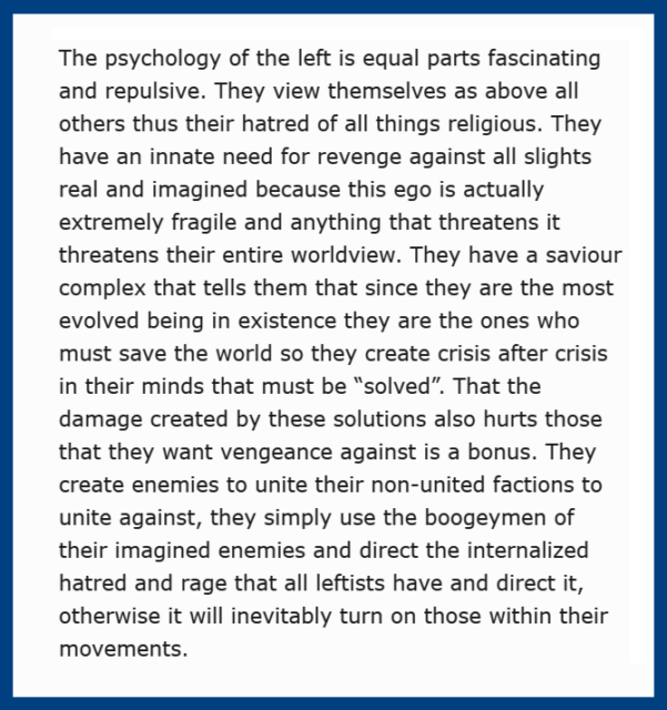 The psychology of the left is equal parts fascinating and repulsive. They view themselves as above all others thus their hatred of all things religious. They have an innate need for revenge against all slights real and imagined because this ego is actually extremely fragile and anything that threatens it threatens their entire worldview. They have a saviour complex that tells them that since they are the most evolved being in existence they are the ones who must save the world so they create crisis after crisis in their minds that must be “solved”. That the damage created by these solutions also hurts those that they want vengeance against is a bonus. They create enemies to unite their non-united factions to unite against, they simply use the boogeymen of their imagined enemies and direct the internalized hatred and rage that all leftists have and direct it, otherwise it will inevitably turn on those within their movements.